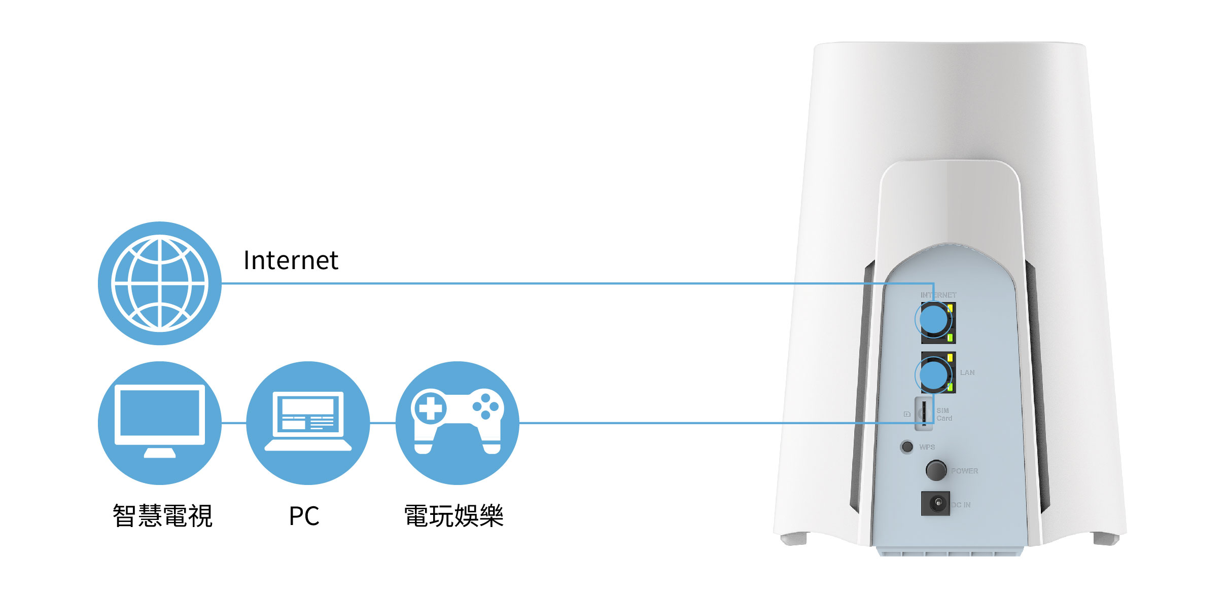 - 連接埠介面具1個GE LAN埠,1個GE WAN埠,1個4FF Nano-SIM卡插槽,WPS按鈕,電源開關鈕