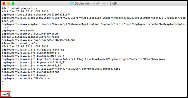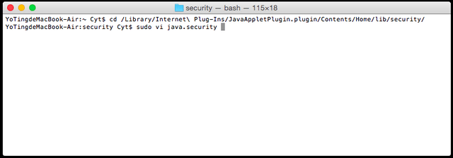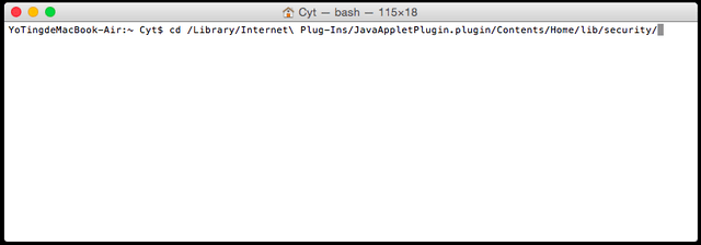 2. Type “cd /Library/Internet\ Plug-Ins/JavaAppletPlugin.plugin/Contents/Home/lib/security/ “ to enter Java security