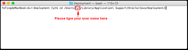 8. Type “cd /Users/xxxxx/Library/Application\ Support/Oracle/Java/Deployment”. (Note: xxxxx is your user name on the Mac. If you are not sure, type “cd”, then type ”pwd” to retrieve your user name. Use this name to replace “xxxxx” on the command.