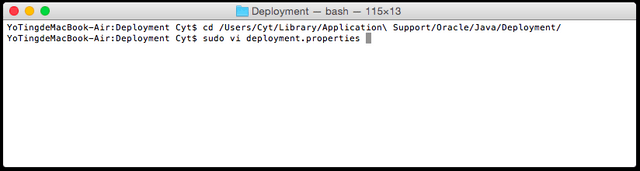 9. Type “sudo vi deployment.properties”, then enter your computer password to run the command.