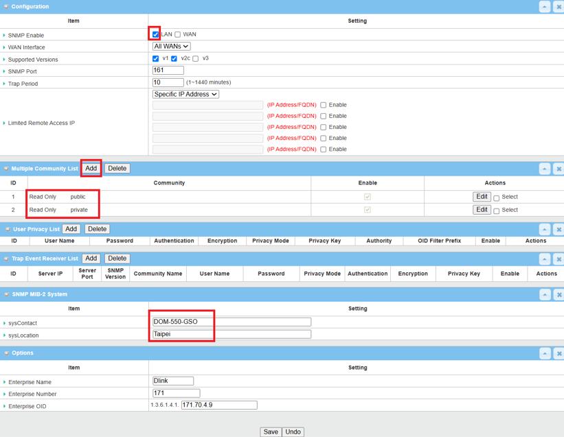 Specify the privilege for the community: 1. Select Read Only (GET and GETNEXT requests) and enter public for SNMP community name 2. Select Read/Write (GET, GETNEXT, and SET requests) and enter private for SNMP community name |