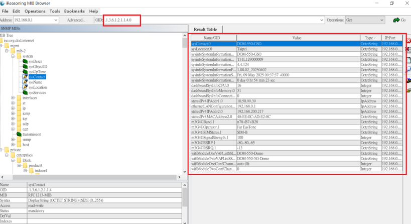 The NMS (Network Management System) collects device information from the DOM-550-GSO via the SNMP protocol. The following is the test result of collecting device information on the iReasoning MIB Browser tool using the OIDs in Table 1.