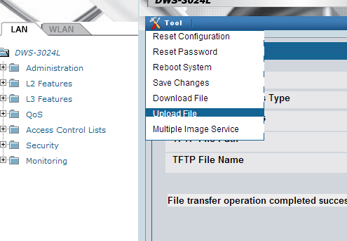 3. In the web interface for the DWS-3024, go to "Tool" button and then "Upload File"