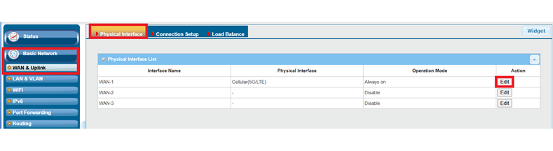 Go to Basic Network > WAN & Uplink > Physical Interface tab