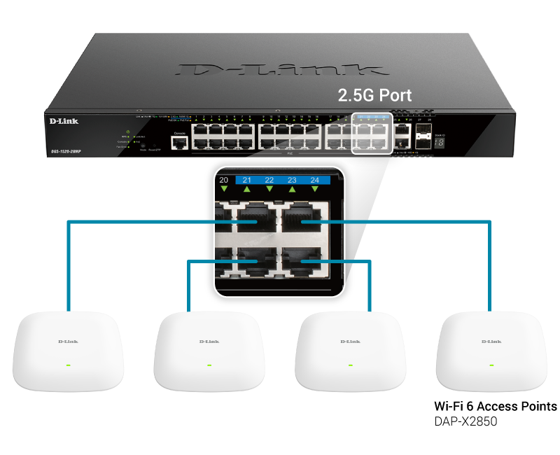 Multi-Gigabit ports on the DGS-1520 Series switch (PoE models only) support 100 MB / 1 GB / 2.5 GB speeds to maximize various device capabilities, such as Wi-Fi 6 (802.11ax) access points, which can often exceed single Gigabit speeds.