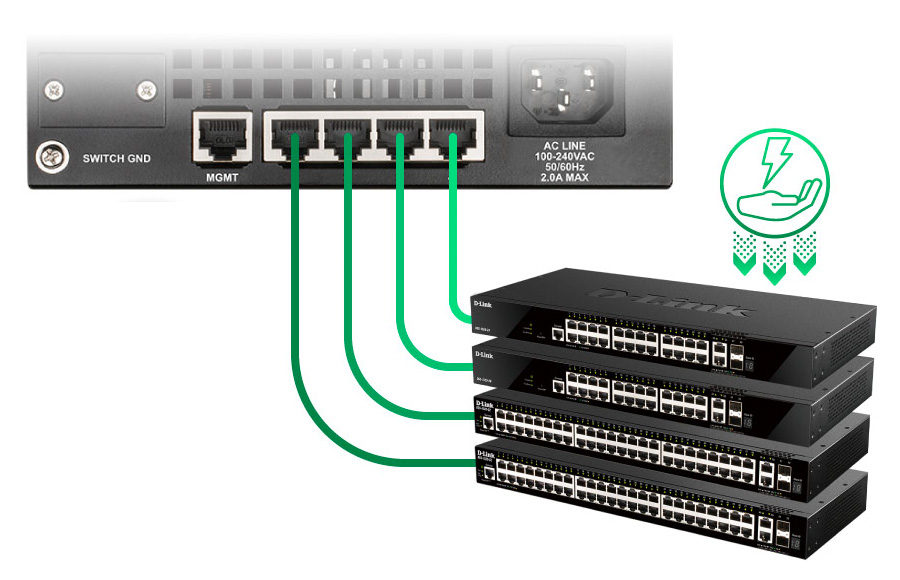 | 2 x 10GBase-T + 2 x SFP+ ports for stacking and connection to the network core | Physically stack up to 8 switches with a total of 80G stacking bandwidth. |