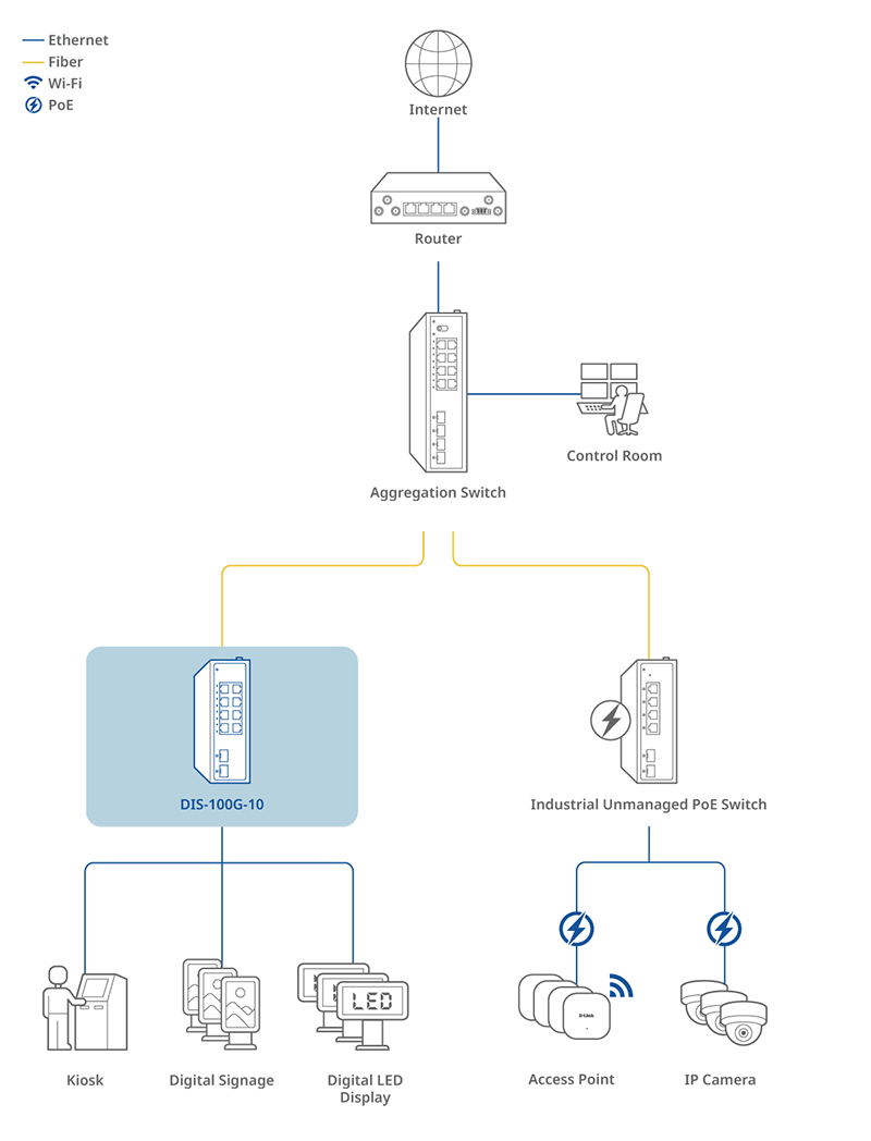 The DIS-100G-10 is an industrial unmanaged switch equipped with eight 1G ports and two SFP ports, providing plug-and-play simplicity deployment. The SFP ports support long-range data transmission, removing the distance limitations of traditional Ethernet cabling. With reliable, high-performance operation, it ensures real-time data transfer and seamless connectivity for applications such as Kiosk, digital signage, LED displays, and more.