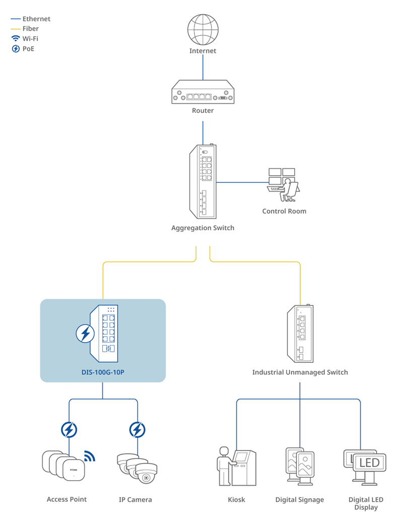 The DIS-100G-10P is an industrial unmanaged switch equipped with eight 1G PoE ports and two SFP ports, providing plug-and-play simplicity for deployment. The SFP ports support long-range data transmission, removing the distance limitations of traditional Ethernet cabling. With reliable, high-performance operation, it's well-suited for edge deployments in applications like HD surveillance, wireless access points, and more.