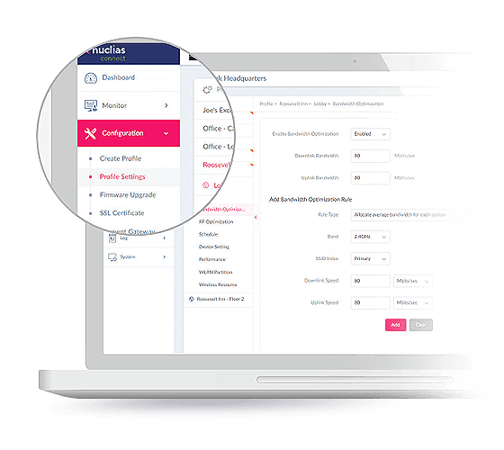 | | Role-based access with remote management Assign different privileges to users and conveniently configure all devices from the Nuclias Connect app or web UI. |